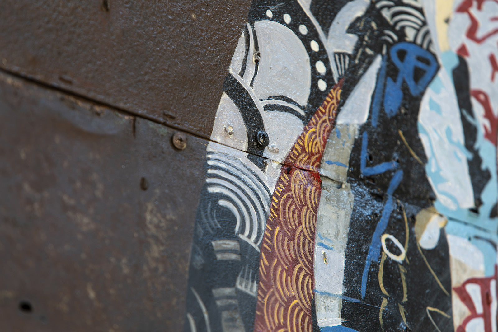 Ce portrait de geisha marie tradition et modernité dans une composition audacieuse. Le visage pâle, d’une grande sobriété, contraste avec le kimono éclatant recouvert de motifs mêlant inspirations classiques japonaises et graffiti urbain. La figure, élégante et mystérieuse, se détache sur le fond métallique marqué par le temps.